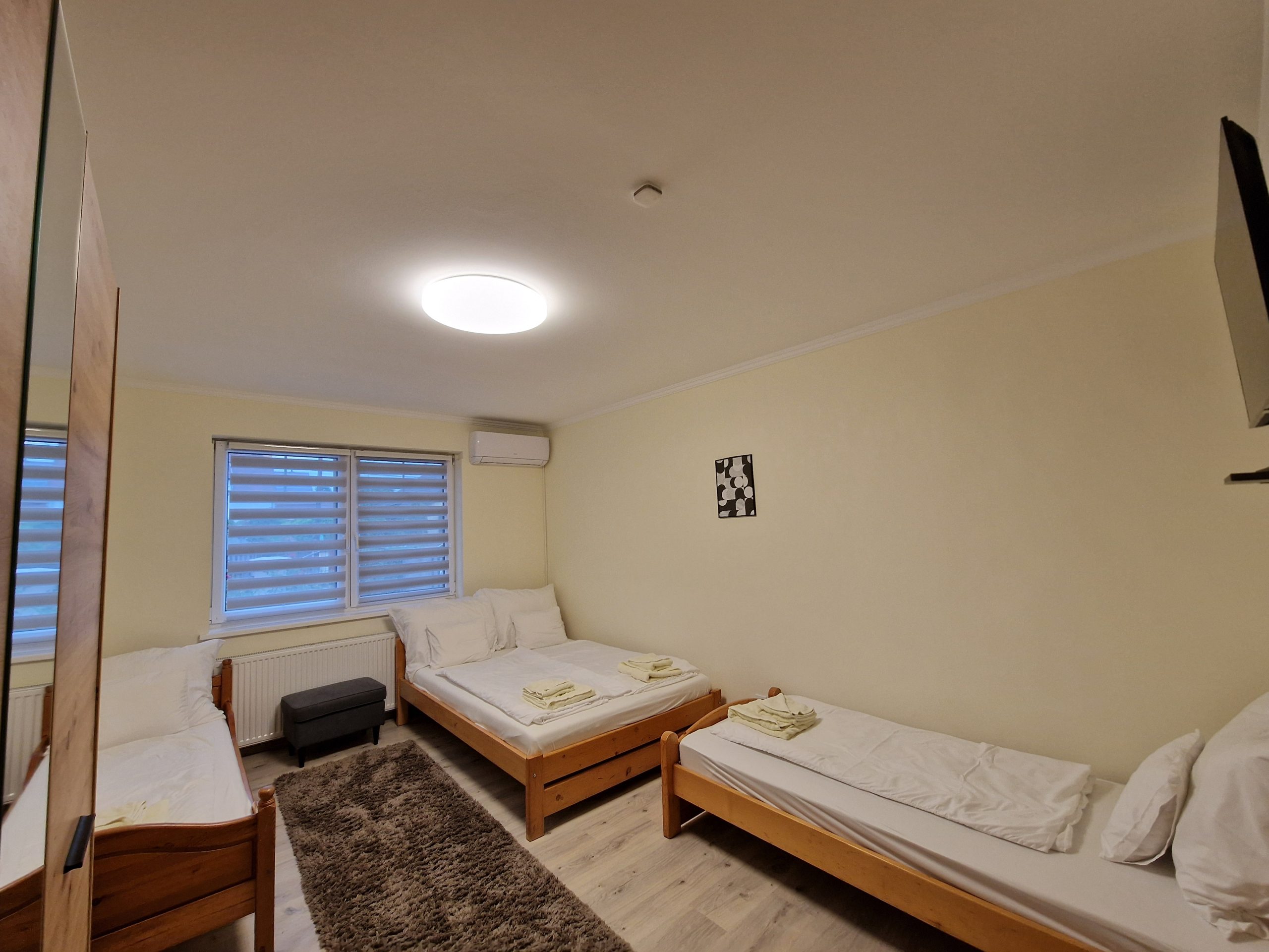 Az apartman két külön 3 szobás lakrésszel rendelkezik, amihez szobánként fürdőszoba, Led tv, klíma, ingyenes Wifi használat és lakrészenként jól felszerelt konyha tartozik.